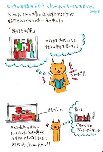 前々回の記事で、k.m.p.さんの本を買ったということを書きました。 今回はこの本のことをもうちょっと書きますー。 この本「k.m.p.のちいさなおかたづけ。」は、 おかたづけ本ですが普通のハウツー本的なのとは違って、 実際にk.m.p.のおふたりがふたりの仕…