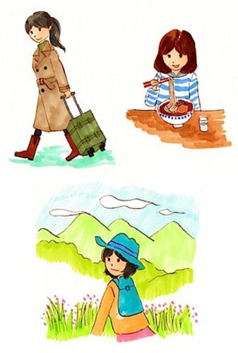 カット(雑誌とかの挿絵のような小さな絵)の練習もした方がいいかなーと3点ほど描いてみた。 旅がテーマとなっております。(いっこはラーメン食べてる絵だけど…旅か?) イラスト教室では1点もの(大きさはB4〜A3くらい)がほとんどだし、 ブログ用では…