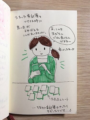 家計簿をスマホでたまにつけています。 レシート見ながら入力するんだけど、 「あーこんなとこ行ったな」「友達とご飯食べたなー」とか いろんなことを思い出して、ちょっとほっこりするのでした。 ちなみに、家計簿はすぐさぼってしまうので、 家計に効果が…