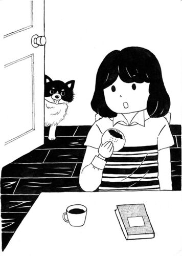今回は、教室で描いたイラストですー。 白黒で描くという課題だったのですが、途中でアプリでスキャンして、一部色をつけたバージョンも作ってみました。色つけもiPadアプリ(Fresco)でしています。 パンを食べてるとこを愛犬に見つかったという場面です。 …