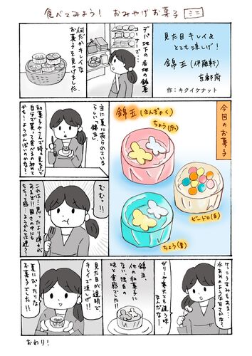 今日はおみやげお菓子のミニ版(1ページ)です。京都のお菓子を食べてみましたー。 おまけのおみやげ話。 今回買ってみた「錦玉(きんぎょく)」。ようかんなどが売っている和菓子店だと時々見かけるし、贈答用には買ったことがあったのですが、自分用に買っ…